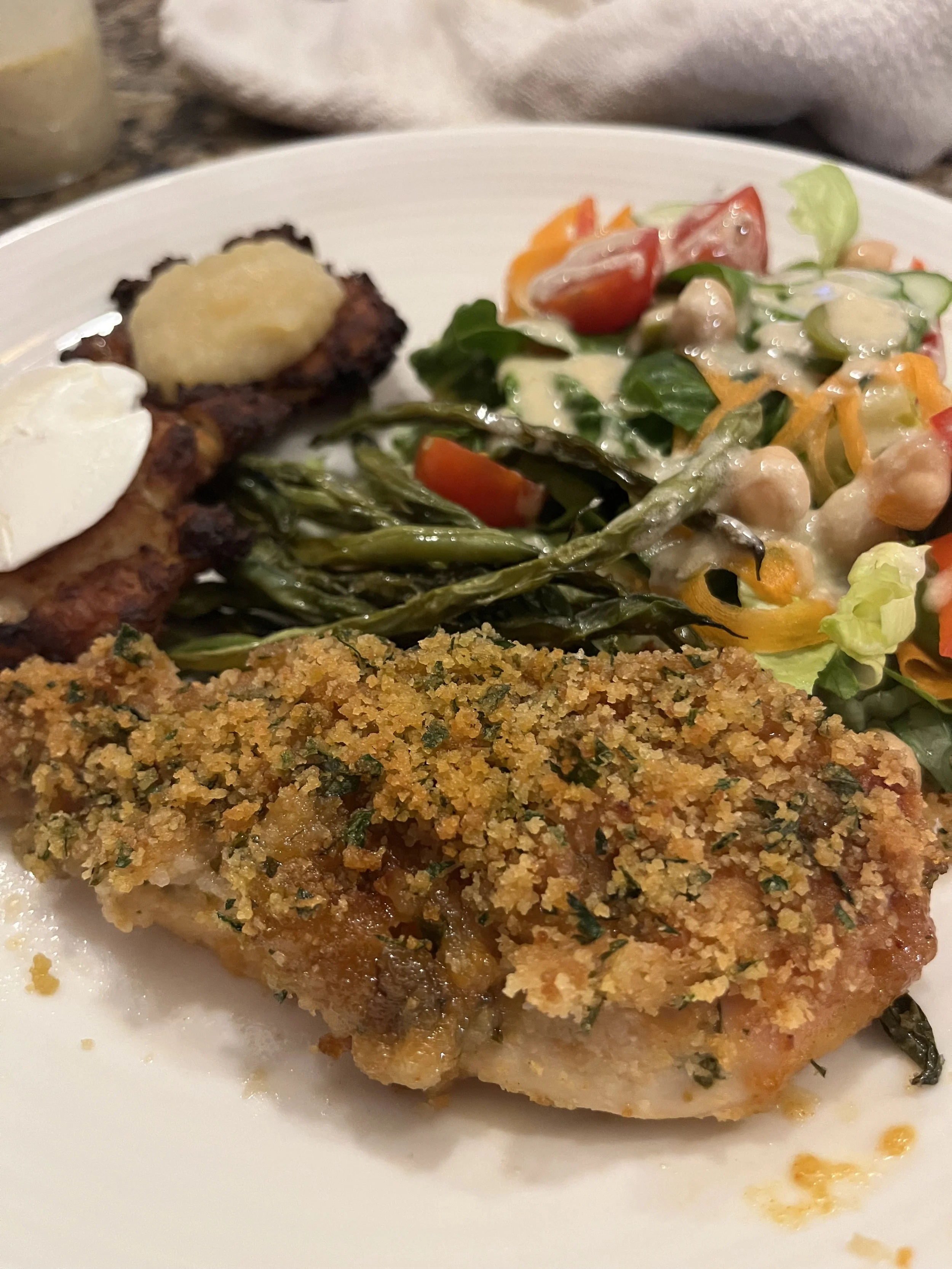 4️⃣ Prepare the Topping: In a small bowl, combine breadcrumbs, garlic powder, parsley, and olive oil. Sprinkle evenly over the chicken.